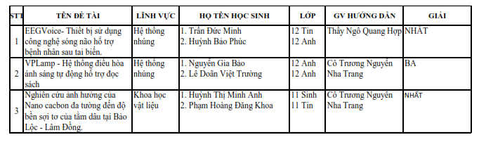 1. Nghiên cứu ảnh hưởng của Nano cacbon đa tường đến độ bền sợi tơ của tằm dâu tại Bảo Lộc - Lâm Đồng (tác giả: Nguyễn Thị Minh Anh – Lớp 11 Sinh; Phạm Hoàng Đăng Khoa – Lớp 11 Tin);