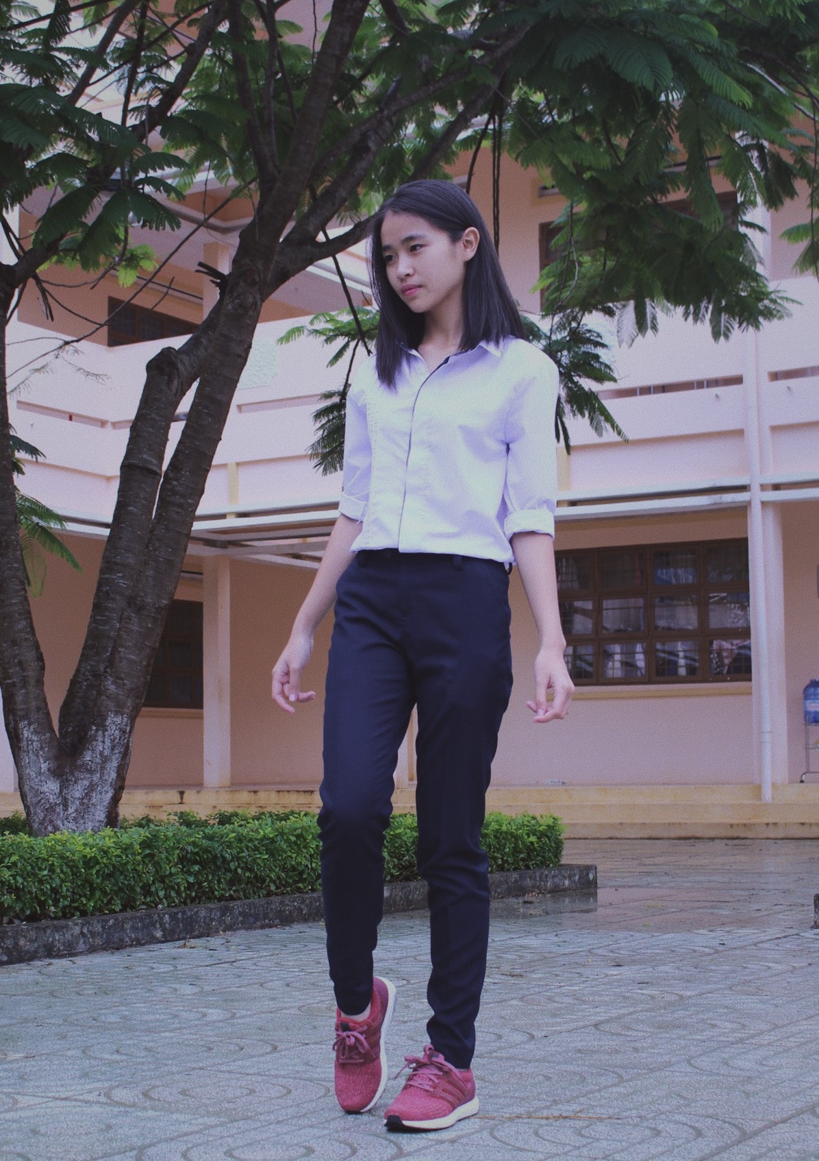 Quần tây xanh, áo sơ mi trắng