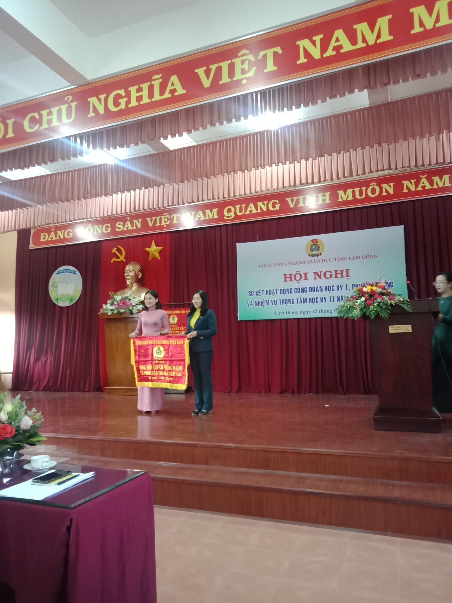 Tại Hội nghị sơ kết Công đoàn ngành cũng đã trao cờ, bằng khen của Tổng liên đoàn cho các tập thể, cá nhân có thành tích xuất sắc trong hoạt động công đoàn năm học 2019-2020. Công đoàn cơ sở trường THPT Chuyên Bảo Lộc đã vinh dự dược nhận cờ thi đua toàn diện của Tổng liên đoàn Lao động Việt Nam. Đây là phần thưởng cao quý đã tôn vinh và ghi nhận sự nỗ lực vươn lên không ngừng trong nhiều năm qua về hoạt động chuyên môn và phong trào của tập thể cán bộ, giáo viên, nhân viên trong nhà trường.