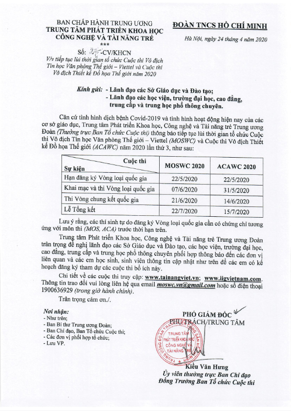 Công văn Lùi lịch MOSWC, ACAWC 2020 - TW Đoàn - Ngày 29/4