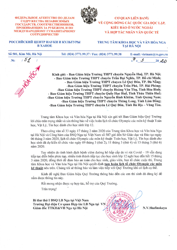 CÔNG VĂN THÔNG BÁO TẠM HOÃN TỔ CHỨC OLYMPIC NGA 2020