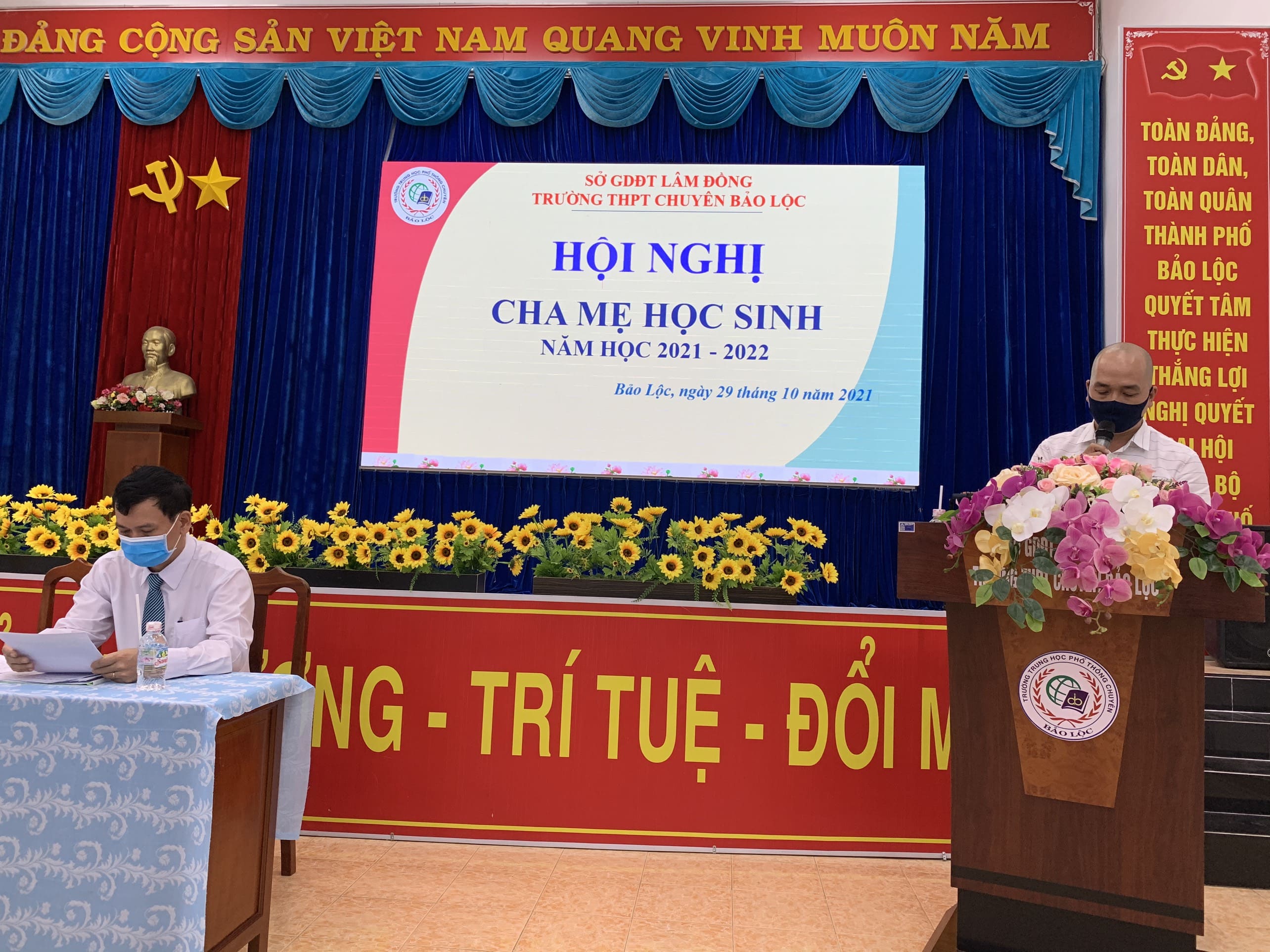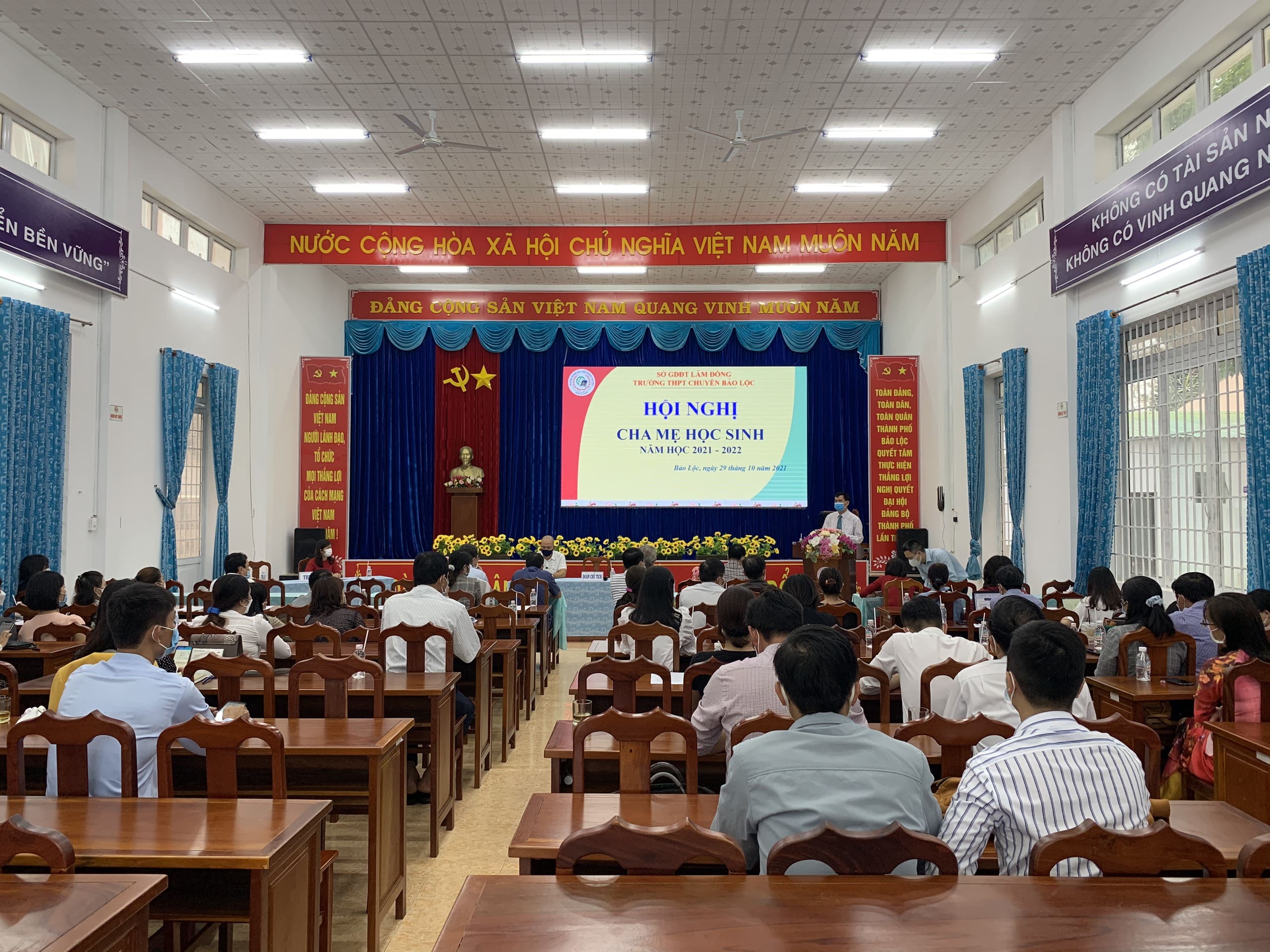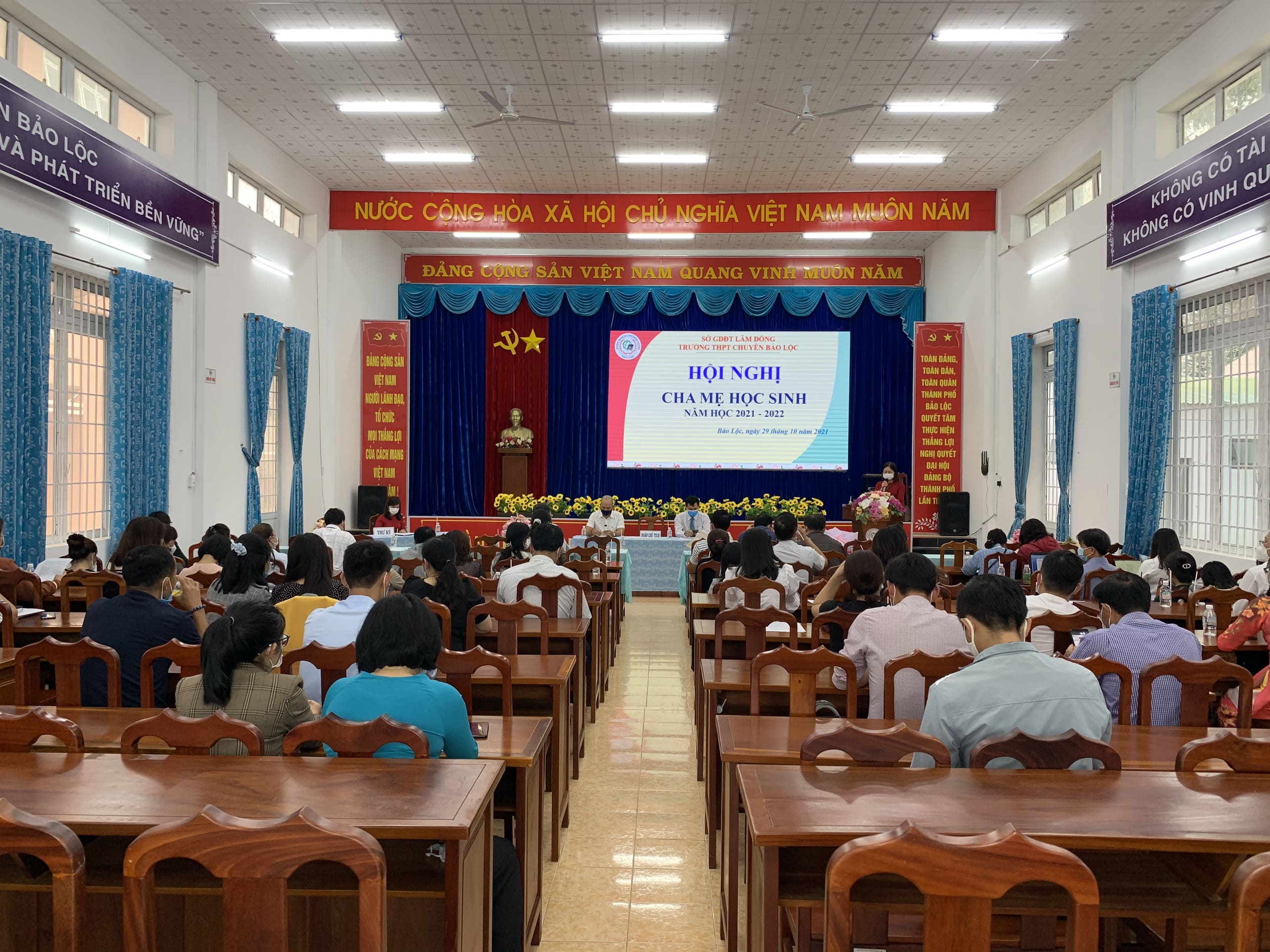 Thực hiện kế hoạch năm học 2021 – 2022, lúc 14g ngày 29 tháng 10 năm 2021, tại hội trường trường THPT Chuyên Bảo Lộc long trọng tổ chức Hội nghị Cha mẹ học sinh năm học 2021 – 2022. Dự buổi lễ có thầy Hoàng Tuấn Anh – Bí thư chi bộ, hiệu trưởng nhà trường, các ông bà trong Ban đại diện của 21 lớp và Ban đại diện CMHS nhà trường. Tại Hội nghị, đã thông qua báo cáo tổng kết đánh giá những hoạt động nổi bật và một số tồn tại cần khắc phục, đồng thời đề ra phương hướng nhiệm vụ cho năm học 2021 – 2022. Trong quá trình thảo luận, tinh thần dân chủ, đóng góp ý kiến tâm huyết xác đáng của hội nghị, Phụ huynh rất tin tưởng vào chủ trương, kế hoạch giáo dục của nhà trường và hứa sẽ cùng phối hợp tốt với nhà trường để giáo dục con em mình tốt hơn nữa.