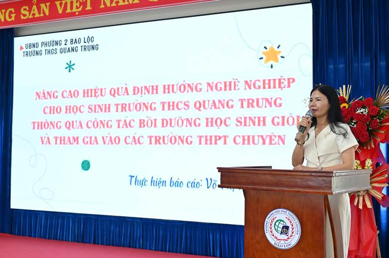 Cô Võ Thị Kim Thoa – Phó Hiệu trưởng trường THCS Quang Trung, Phường 2 Bảo Lộc tham gia báo cáo tham luận: Một số giải pháp định hướng nghề nghiệp cho HS trường THCS Quang Trung thông qua công tác bồi dưỡng học sinh giỏi và tham gia thi vào các trường THPT Chuyên.