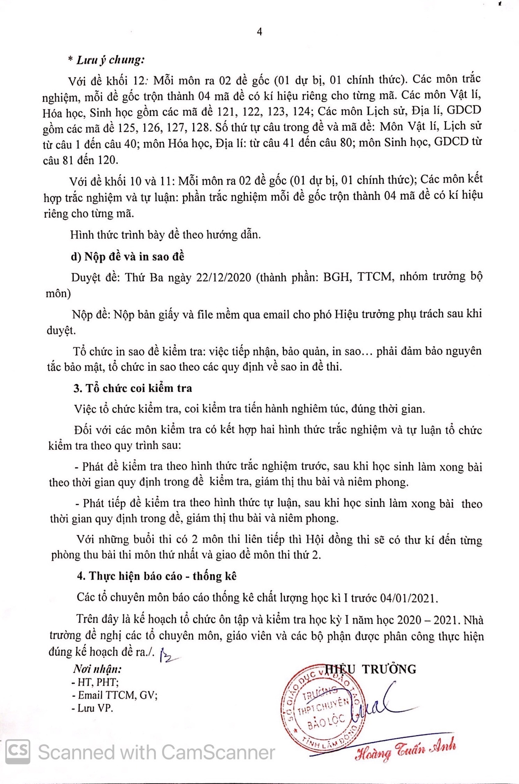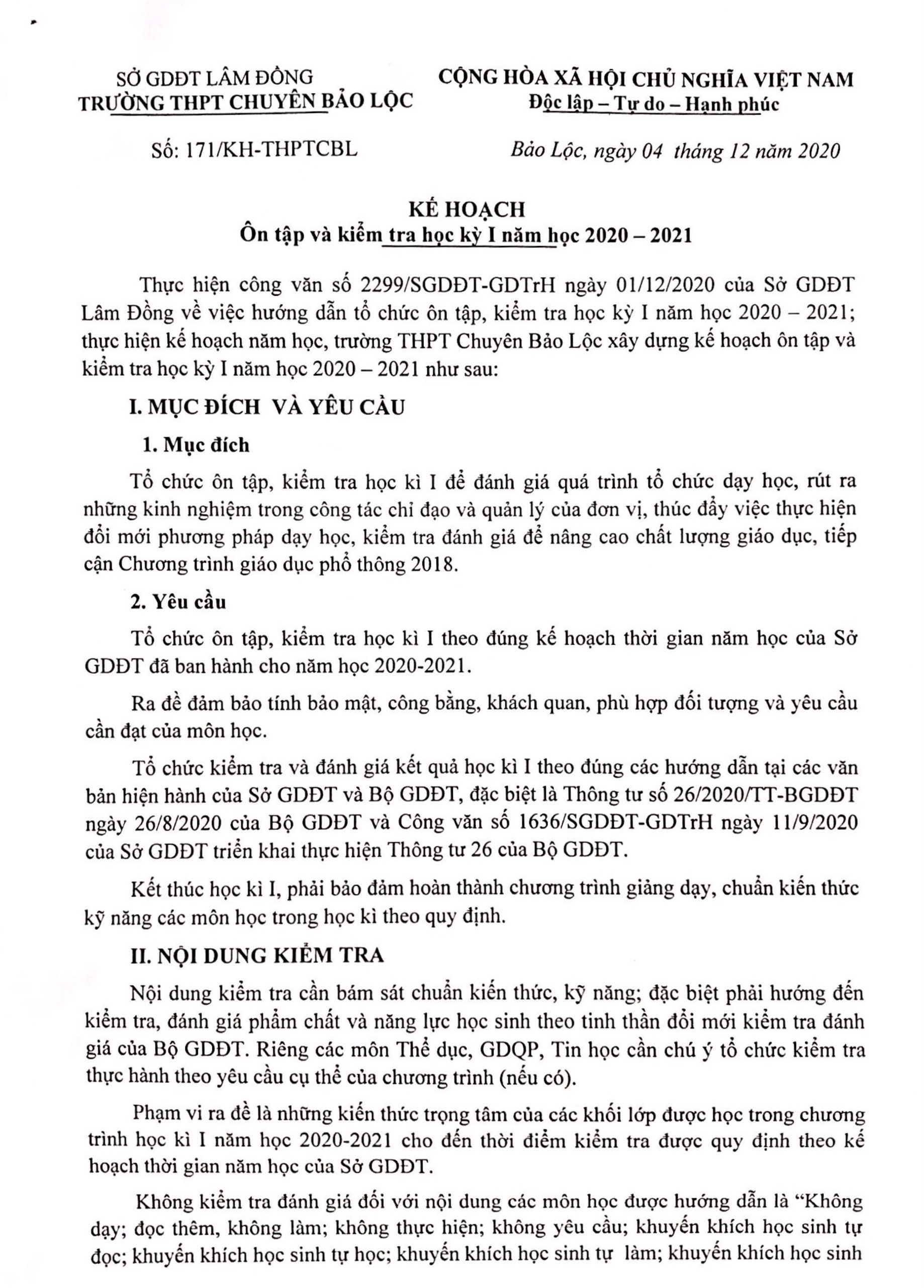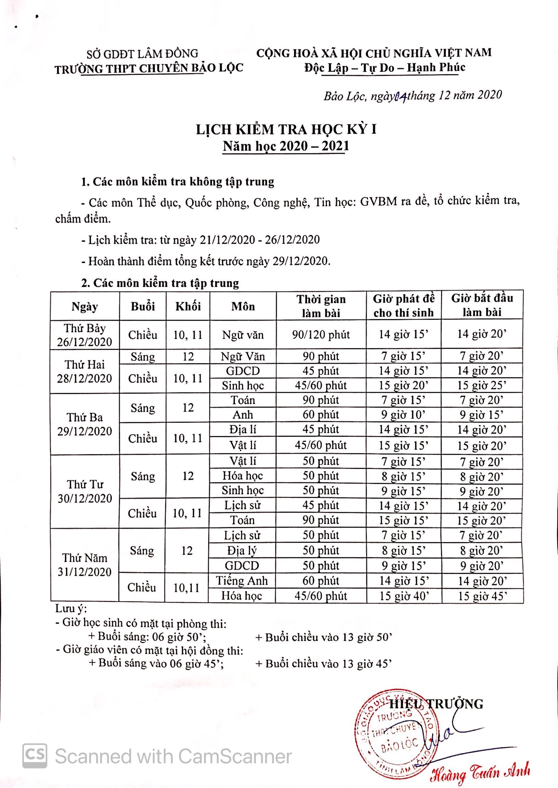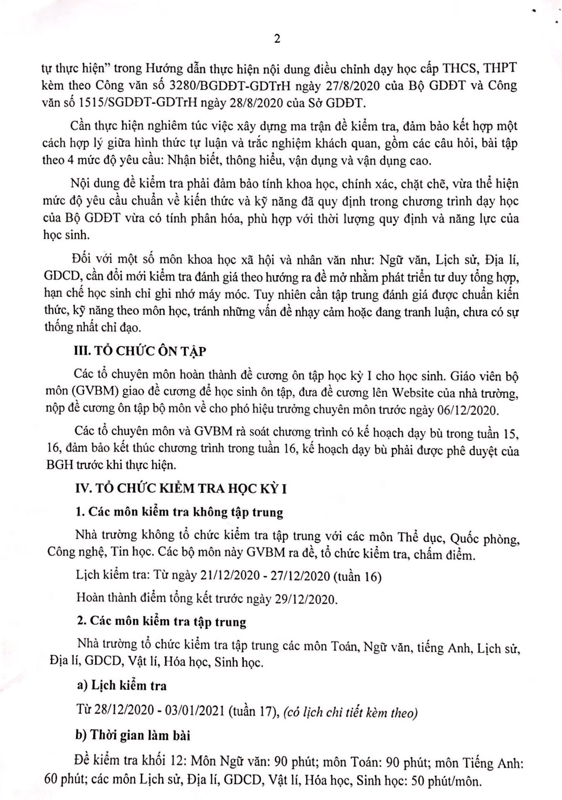 Kế hoạch ôn tập và Lịch kiểm tra học kỳ I năm học 2020 - 2021