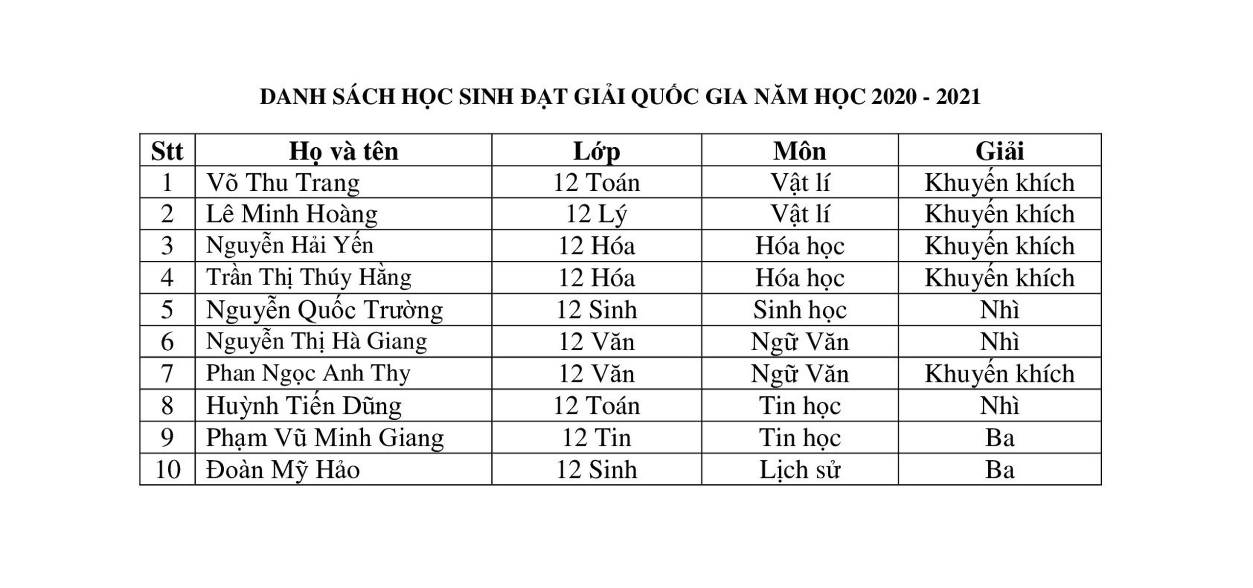 Môn Ngữ văn: 01 Giải Nhì, 01 giải Khuyến khích