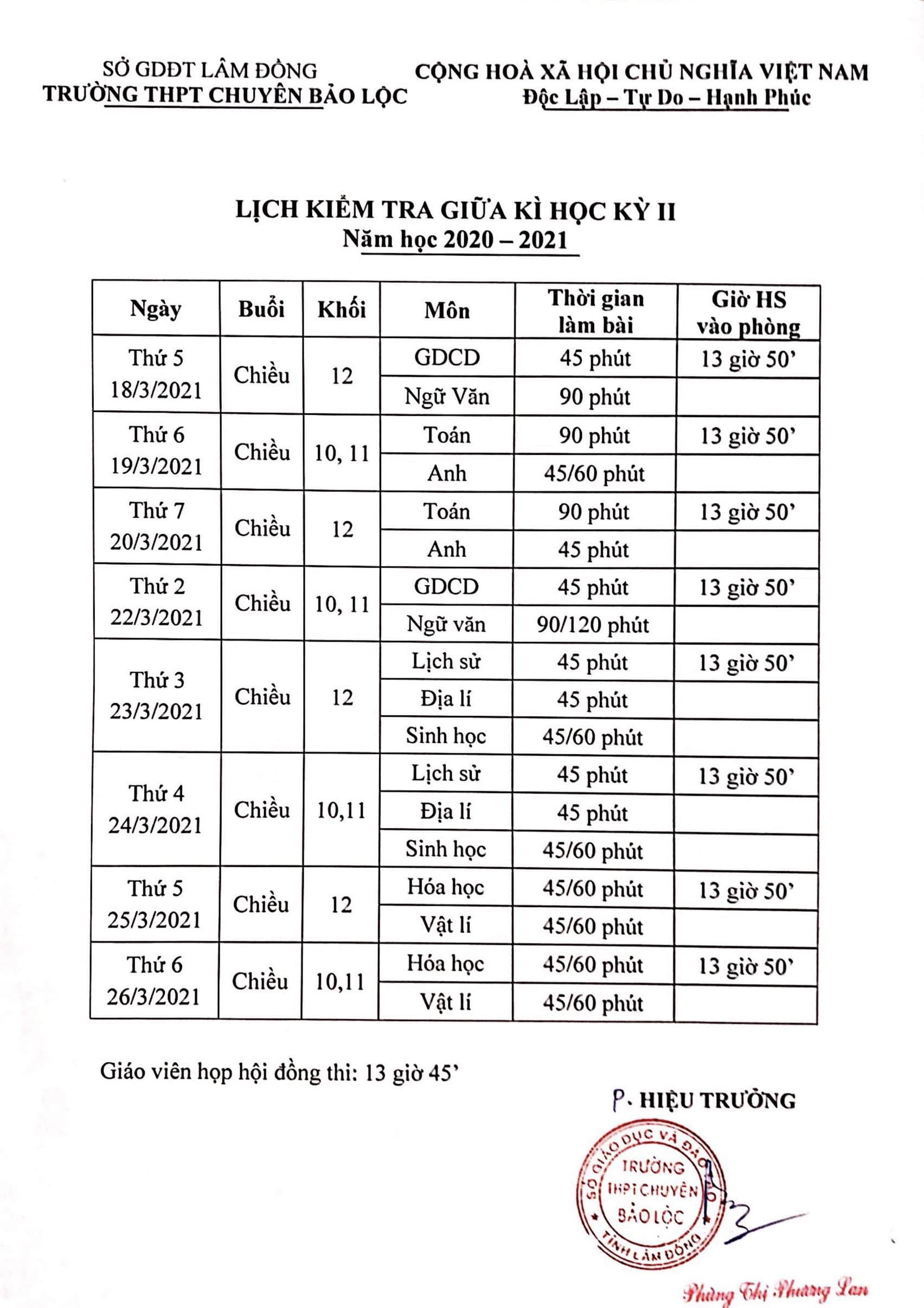 Lịch kiểm tra giữa kỳ học kỳ II - Năm học 2020 - 2021