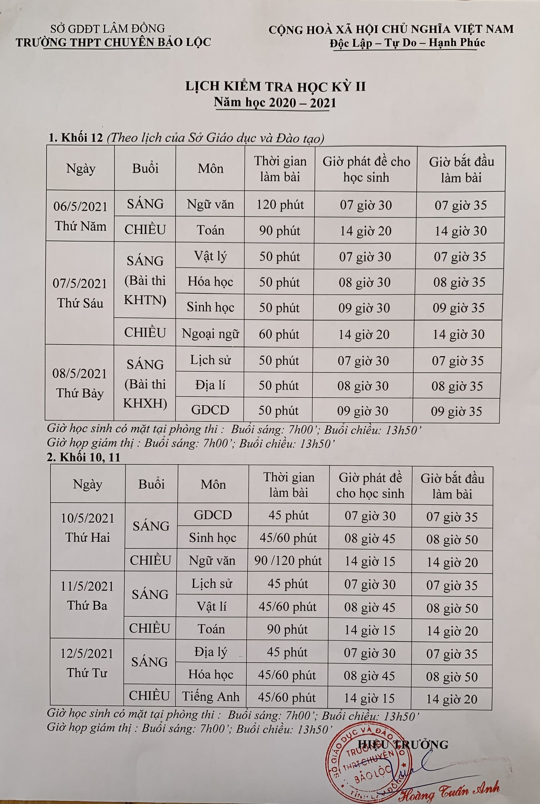 Lịch kiểm tra học kỳ II năm học 2020 - 2021