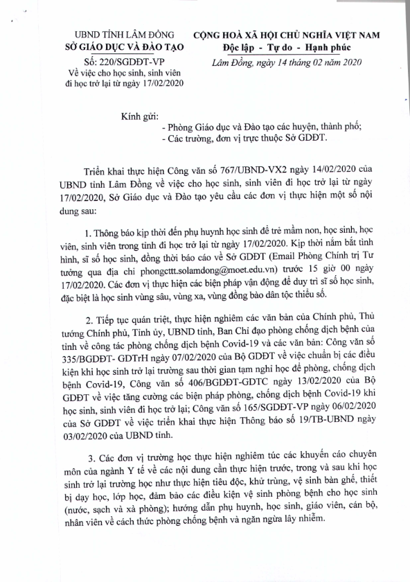 Thông báo về việc kéo dài thời gian nghỉ học của học sinh, sinh viên để phòng chống dịch bện Covid-19