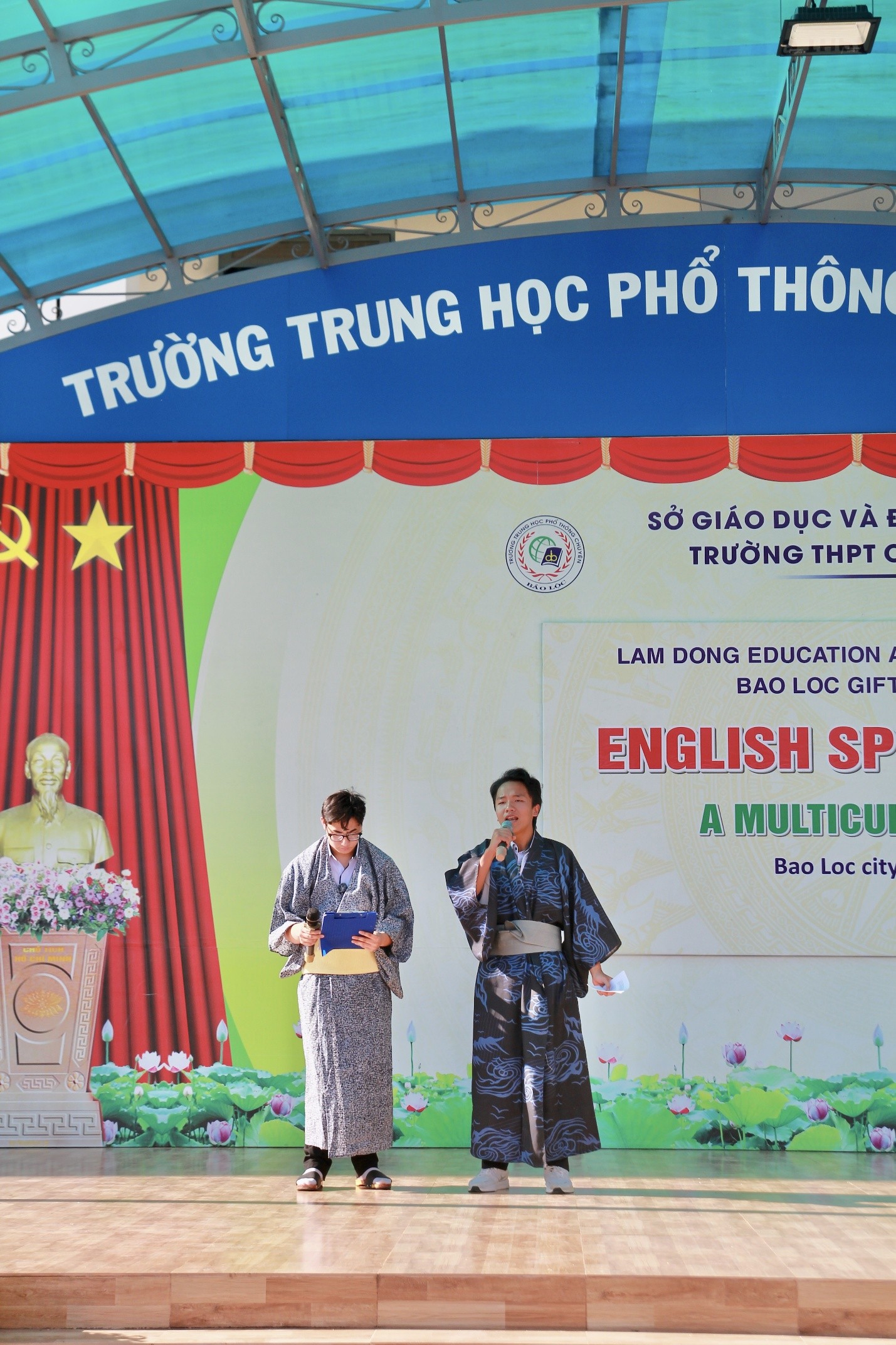 Với chủ đề tuần lễ nói tiếng Anh “A multicultural world”, tổ Ngoại ngữ đã phối hợp với GVCN và đoàn thanh niên tổ chức cho liên quân các khối lớp chuyên giới thiệu về các quốc gia trên thế giới. Dưới sự chuẩn bị chu đáo của liên quân các khối lớp chuyên, văn hóa, phong tục tập quán của các quốc gia trên thế giới được tái hiện một cách hấp dẫn và đầy thú vị trên sân khấu. Những lời bình dẫn, giới thiệu bằng tiếng Anh được các bạn MC trình bày cuốn hút như những sứ giả văn hóa thực thụ của thời đại kết nối 4.0.