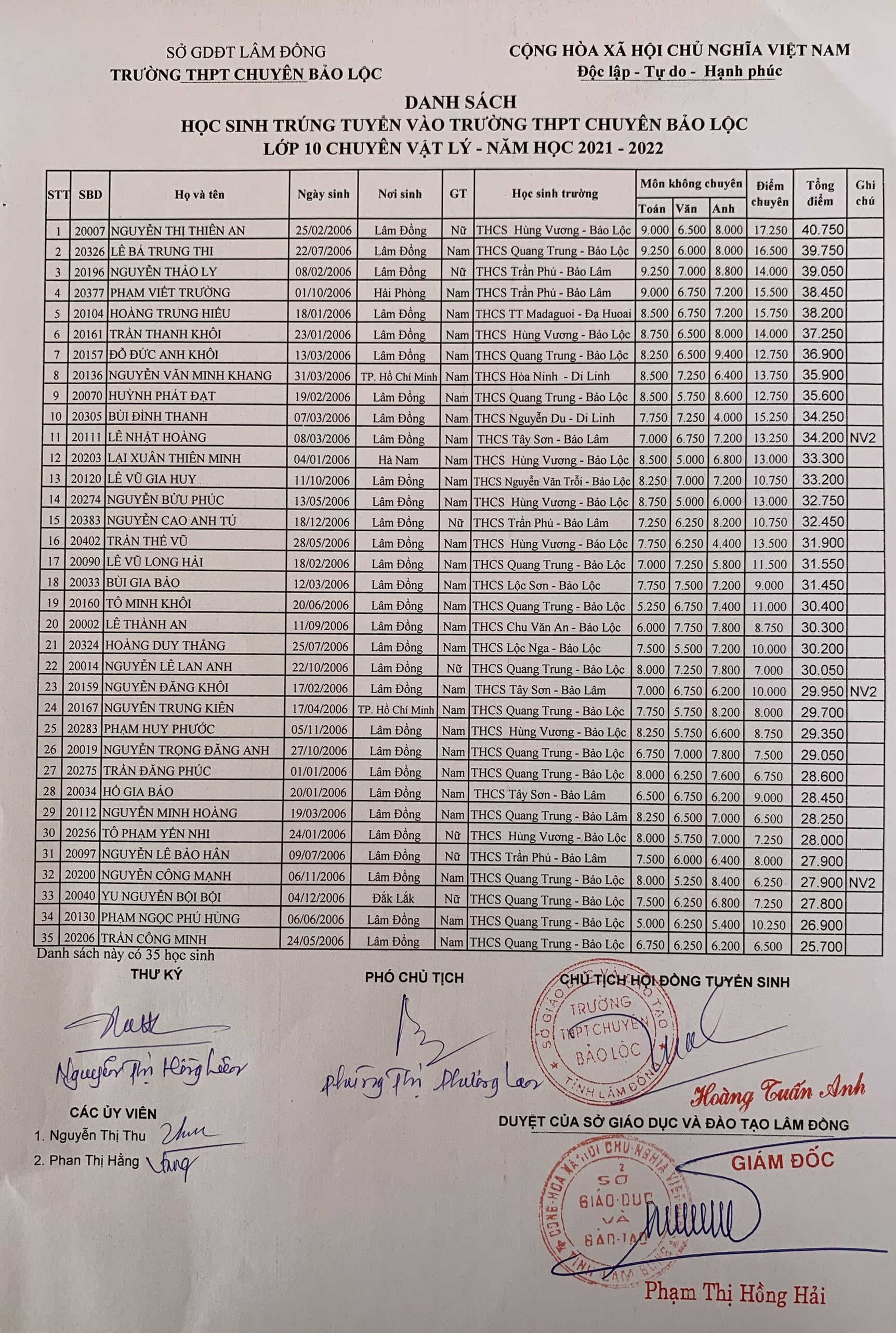 Phê duyệt kết quả tuyển sinh vào lớp 10 Trường THPT Chuyên Bảo Lộc năm học 2025 - 2026
